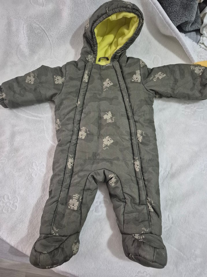 Gri kamuflaj desenli bebek tulumu, kürklü detaylı kapüşon ve yumuşak iç astar ile sıcak tutar. Streetwear tarzında tasarlanmıştır.