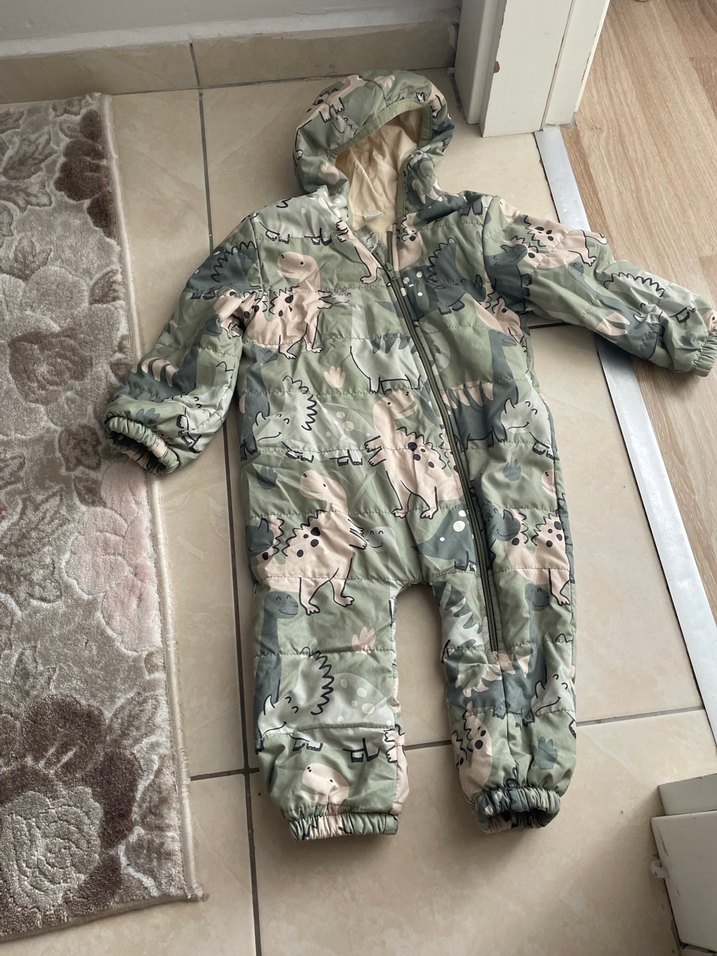 Gri kamuflaj desenli bebek tulumu, kürk detaylı ve yumuşak, sıcak kumaştan. Kapüşonlu ve lastikli manşetli, sokak stili uyumlu.
