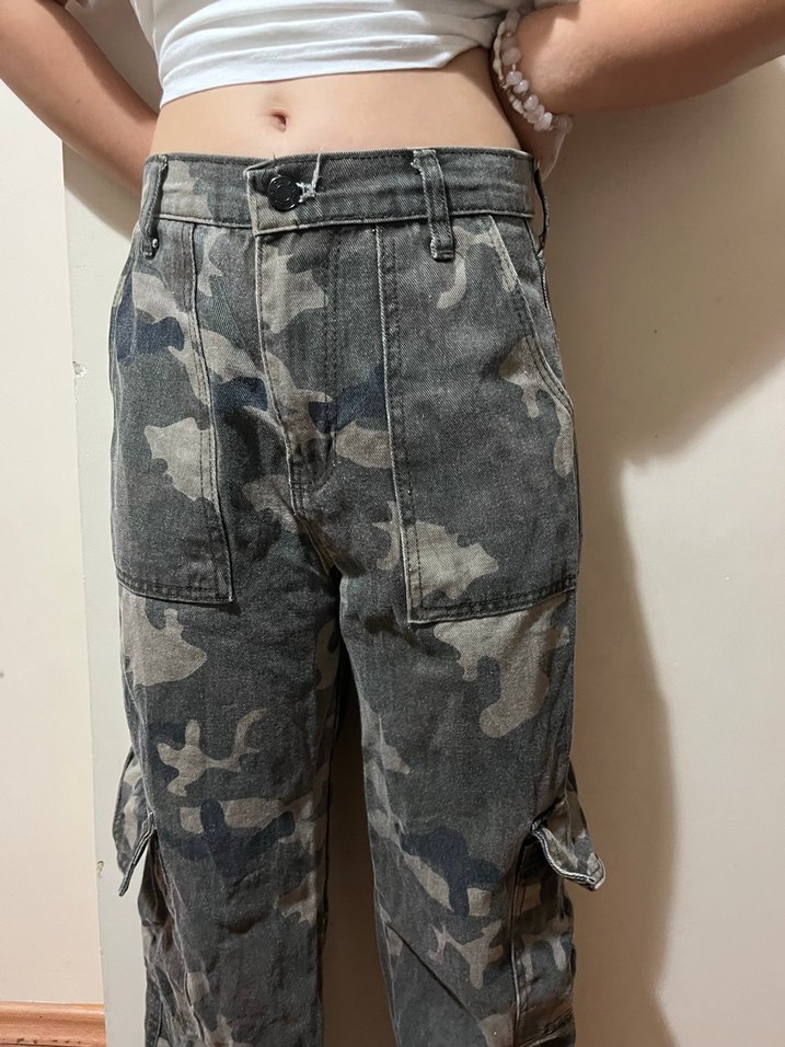 Gri kamuflaj desenli denimden yapılmış, bol kesim ve midi boyda, tokalı detaylara sahip kadın kot pantolon.