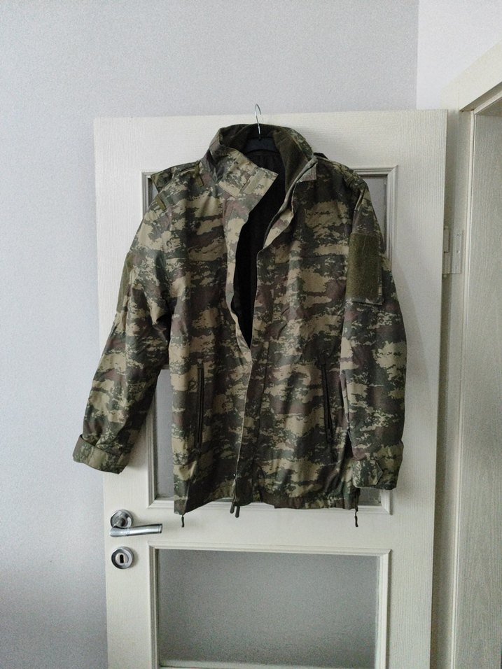 Gri kamuflaj desenli erkek ceket, bol kesim, yakalı ve uzun kolludur. Kemer detaylı, midi boyda, sokak stili için uygundur. Sentetik kumaştandır.