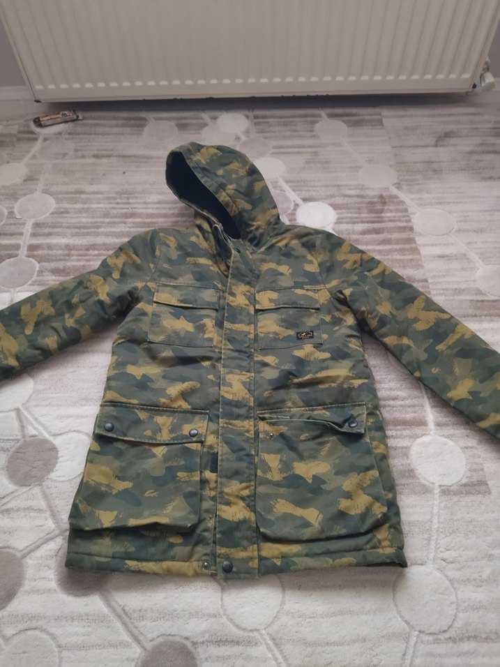 Gri kamuflaj desenli, düğmeli, rahat kesim erkek çocuk mont. Yumuşak ve sıcak polar kumaştan, şık ve rahat kullanım için uygundur. 10 yaş uyumlu