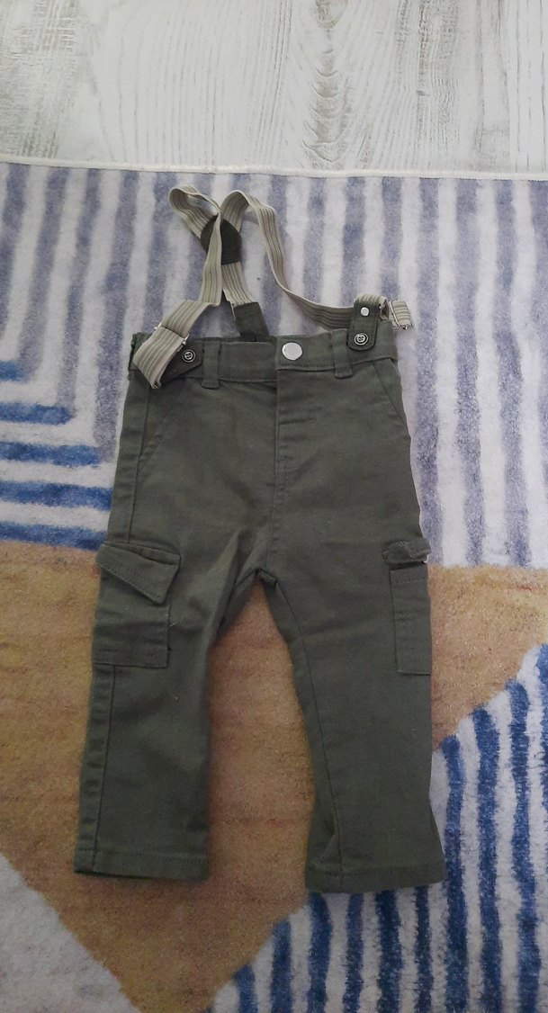 Gri kamuflaj desenli, tokalı askılı, rahat kesim erkek çocuk pantolonu. Yumuşak ve sıcak kumaştan üretilmiştir, sokak modasına uygun.