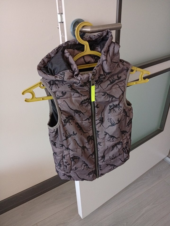 Yüksek yakalı, fermuarlı ve gri kamuflaj desenli, yumuşak ve sıcak kumaştan yapılmış, erkek çocuklar için dar kesim yelek.