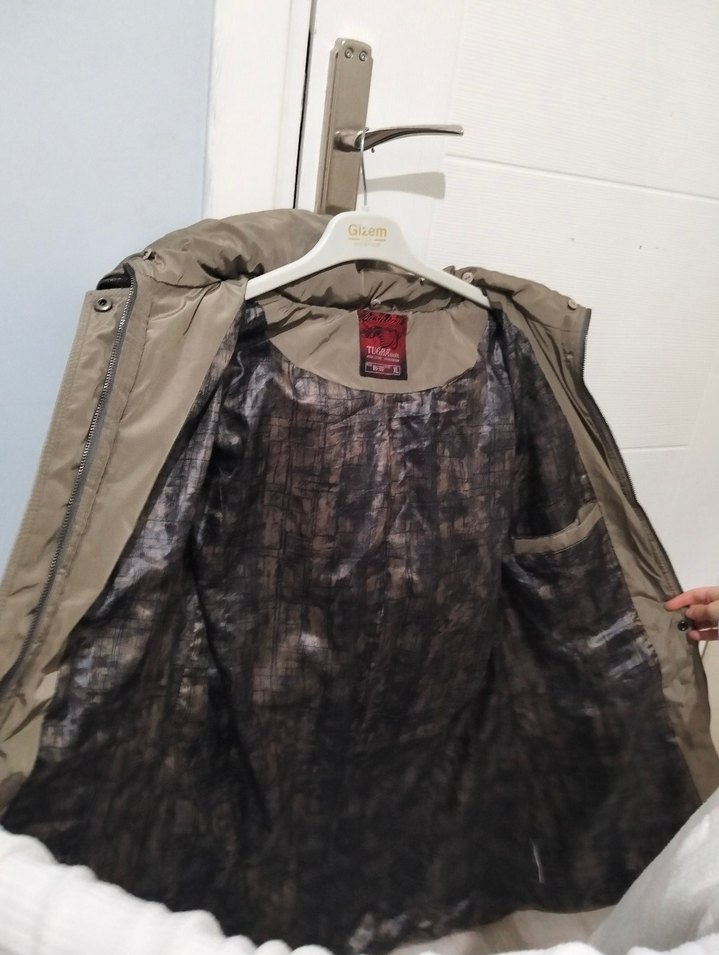 Gri kamuflaj desenli, kolsuz, fermuarlı erkek yağmurluğu, salaş kesim ve bisiklet yaka ile sokak modasına uygun.