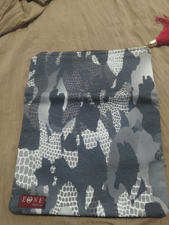 Gri kamuflaj desenli, sentetik kumaştan yapılmış fermuarlı kadın clutch çanta. Günlük kullanıma uygun, çağdaş sokak stilinde tasarlanmıştır. EONE etiketi bulunur.