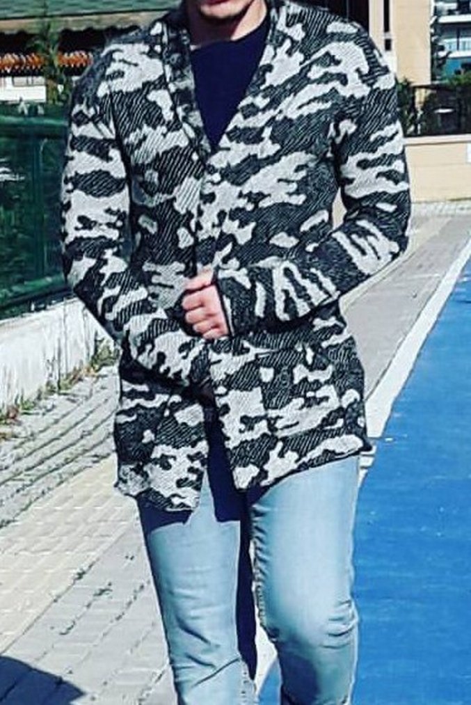 Gri kamuflaj desenli ince ceket. Notlu yaka ve uzun kollu, rahat kesimiyle outdoor sokak stiline uygun.