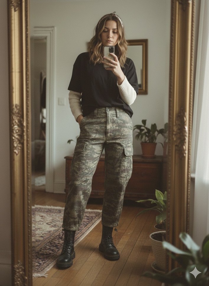 Gri kamuflaj desenli, bol kesim ve midi boy kadın boyfriend pantolon, rahat ve şık günlük kullanım için idealdir.