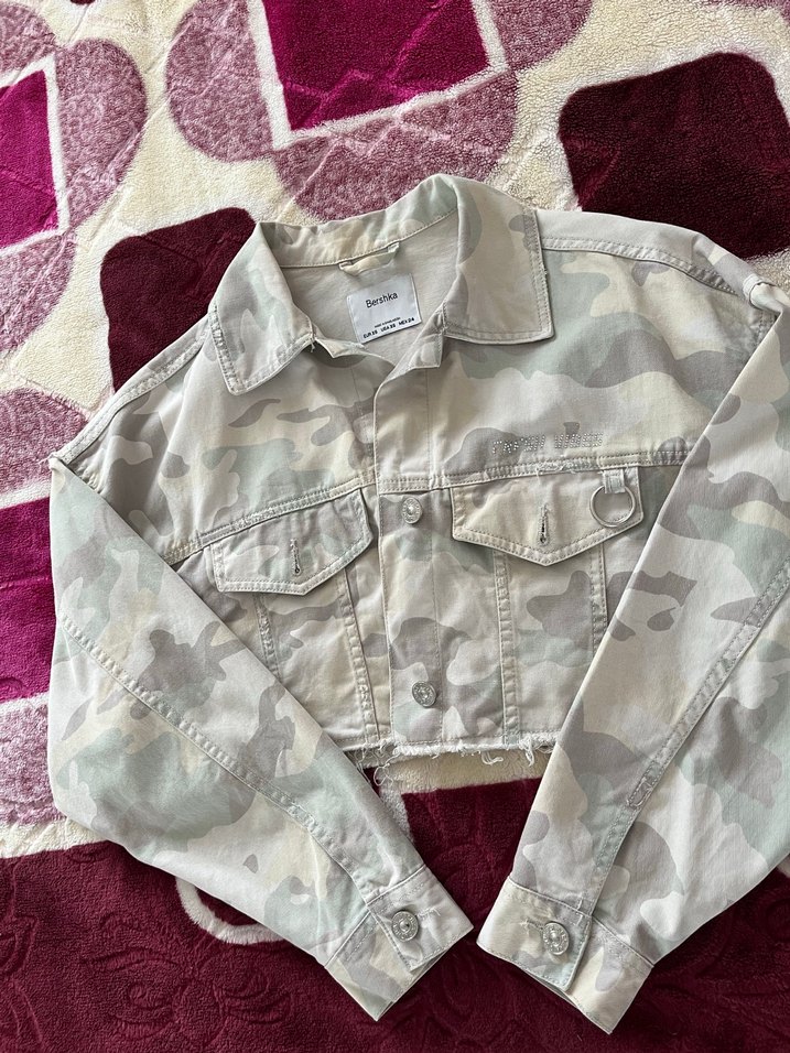 Gri kamuflaj desenli, düğmeli, bol kesim, uzun kollu, kısa boy crop kadın kot ceket. Notlu yaka ve rahat günlük kullanım için uygundur.