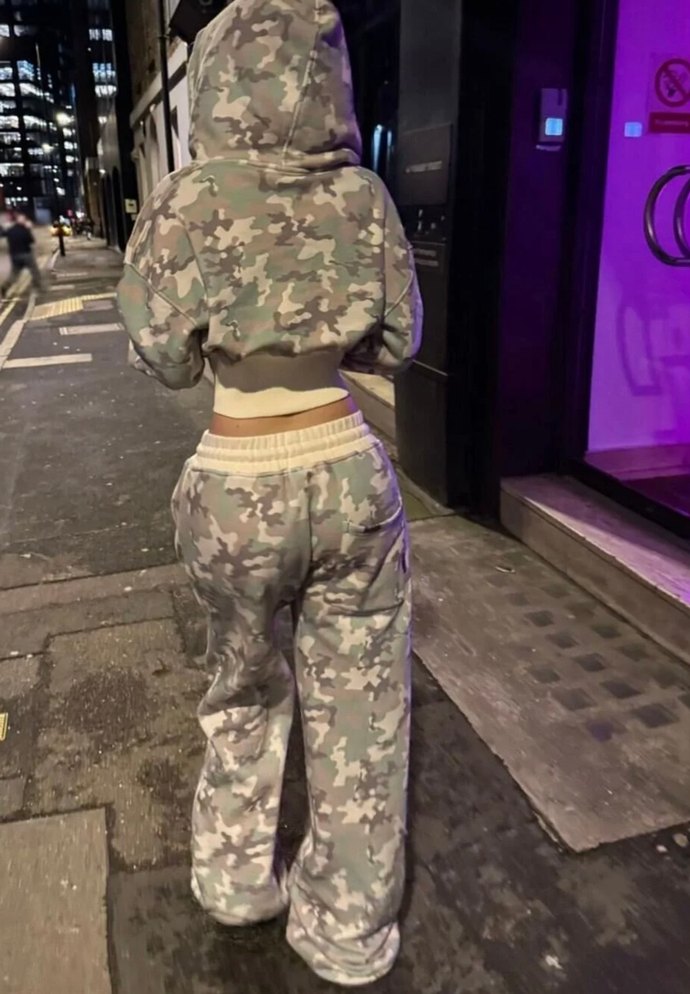 Gri kamuflaj desenli, bol kesim kadın eşofman takımı. Uzun kollu, yüksek yakalı ve kemerli, yumuşak ve sıcak kumaştan yapılmıştır. ️