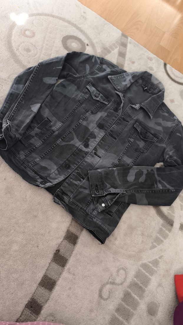 Gri kamuflaj desenli, düğmeli, uzun kollu kadın kot ceket. Rahat kesimi ve yaka detayıyla dış mekanlar için uygun.