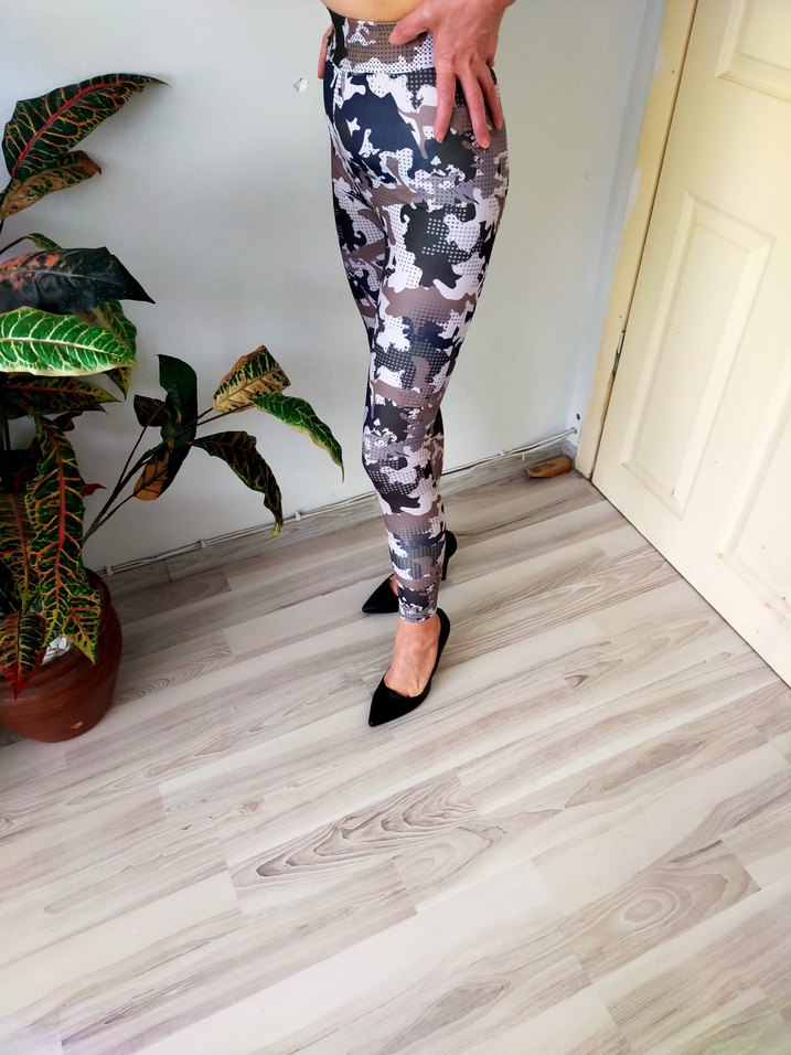 Gri kamuflaj desenli, sentetik kumaştan yapılmış, günlük kullanıma uygun, vücuda oturan midi uzunluğunda kadın taytı. ♀️