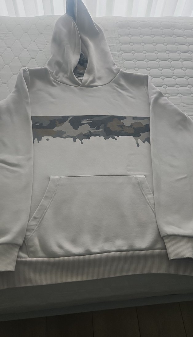 cocuk erkek gri kamuflaj desenli, beyaz tabanlı, kapüşonlu ve uzun kollu sweatshirt. Yumuşak ve sıcak kumaştan, cep ve ribanalı manşetlere sahip, rahat kesim.