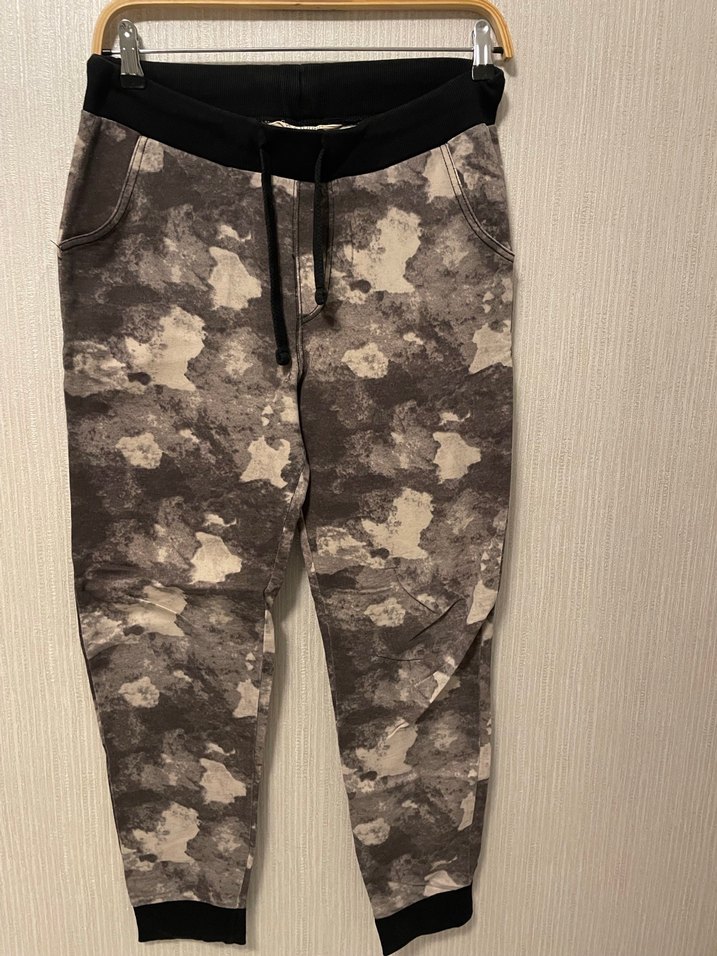 için gri kamuflaj desenli, kemerli, midi uzunlukta ve bol kesim eşofman. Sentetik kumaştan, dış mekan ve sokak tarzı için uygun dolapta bırcok eşofman aktı var