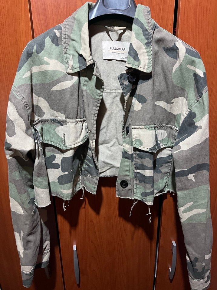 Pamuk kumaştan yapılmış, gri kamuflaj desenli, düğmeli, uzun kollu, kısa ve bol kesim kadın ceket. Notlu yaka tasarımına sahiptir, sokak stili için uygundur.