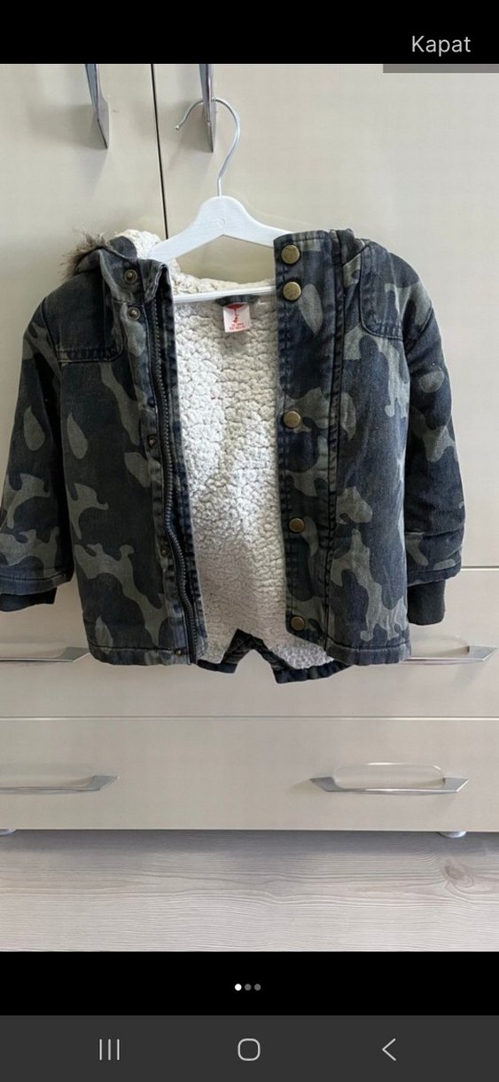 Gri kamuflaj desenli, bol kesim ve yakası kesimli erkek çocuk kot ceketi. İç kısmı yumuşak kürk ile kaplı, sokak stiline uygun.