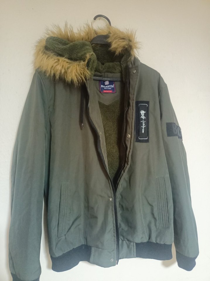 Gri kamuflaj desenli, kürklü kapüşonlu, bol kesim streetwear ceket. Notched lapel yaka ve uzun kollu, dış mekan kullanımı için uygun.