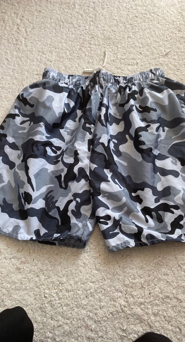 Gri kamuflaj desenli, kısa ve bol kesim erkek şort. Sokak modası tarzında, rahat ve şık dış mekan kullanımı için uygundur.