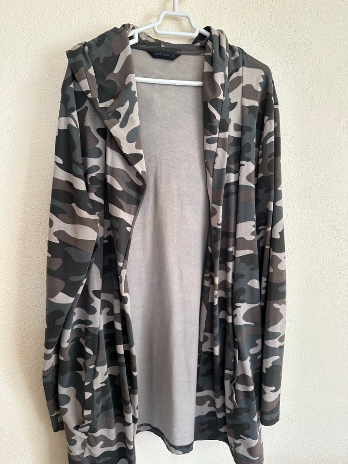 Gri kamuflaj desenli, salaş kesim midi boy kadın ceket. Uzun kollu, yüksek yakalı ve dökümlü tasarıma sahip, yumuşak sentetik kumaftan üretilmiştir.