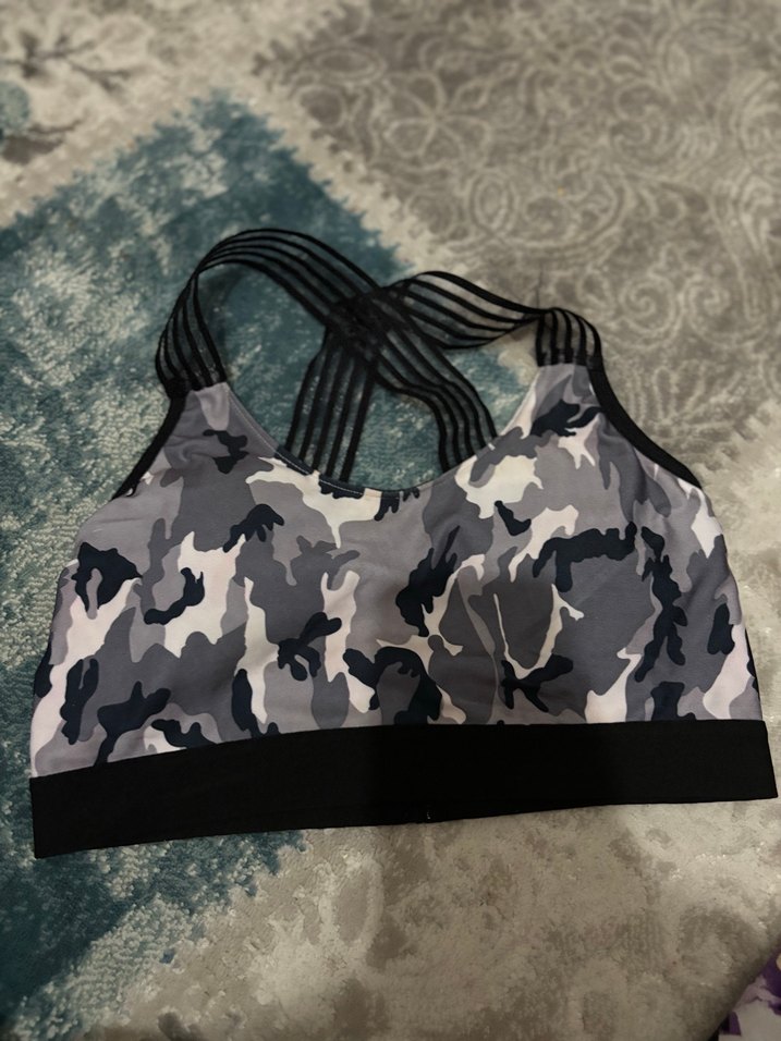 Gri kamuflaj desenli, siyah çapraz elastik askılı, normal uzunlukta streetwear tarzında spor sütyeni. ️♀️