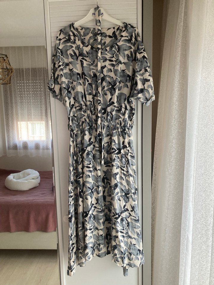 Yüksek bisiklet yakalı, kısa kollu, bol kesim ve drapeli uzun elbise. Gri kamuflaj deseniyle Parisian bohem tarzını yansıtır, günlük kullanıma uygundur.