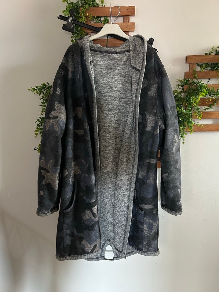 tüm ölçüler mevcut. yeniden farksız. yeri çok kaliteli. .l-xl bedene uygun salaş.Gri kamuflaj desenli, uzun ve bol kesim kadın hırka. Yumuşak ve sıcak iç yüzey, uzun kollu, yaka detaylı ve kürk süslemelidir.