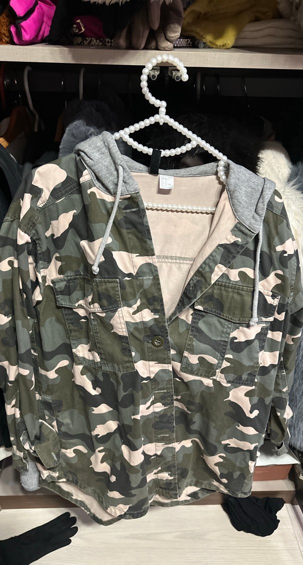 Gri kamuflaj desenli, düğmeli, uzun kollu, salaş kesim kadın ceket. Normal boy ve tekstil kumaştan üretilmiştir.