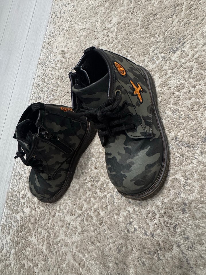 Gri kamuflaj desenli, kauçuk malzemeden yapılmış bot. Herhangi bi deformesi yok az kullanıldı