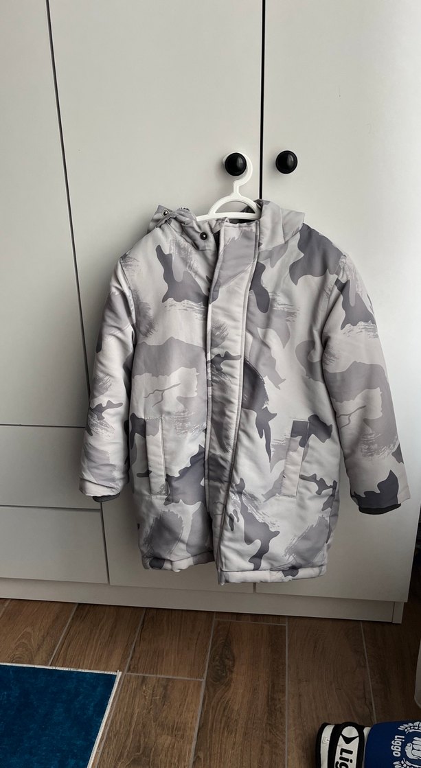 Gri kamuflaj desenli, bol kesim erkek çocuk mont. Yumuşak ve sıcak kumaştan, fermuarlı ve sokak modası tarzında.
