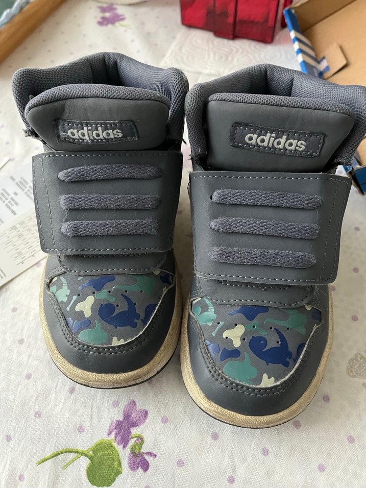 Adidas markalı, gri kamuflaj desenli, cırt cırtlı ve kauçuk tabanlı erkek çocuk spor ayakkabısı.