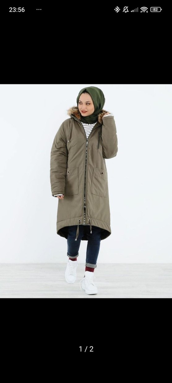 Gri kamuflaj desenli, uzun kollu, bol kesim midi mont. Kürklü kapüşon ve rahat, sıcak dokulu kumaştan, dış mekan kullanımı için uygundur.