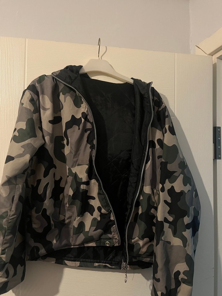 Gri kamuflaj desenli, bol kesim, normal midi boyda kadın spor ceket. Bisiklet yaka, uzun kollu ve fermuarlı, sentetik kumaştan üretilmiş, açık hava kullanımı için uygun.