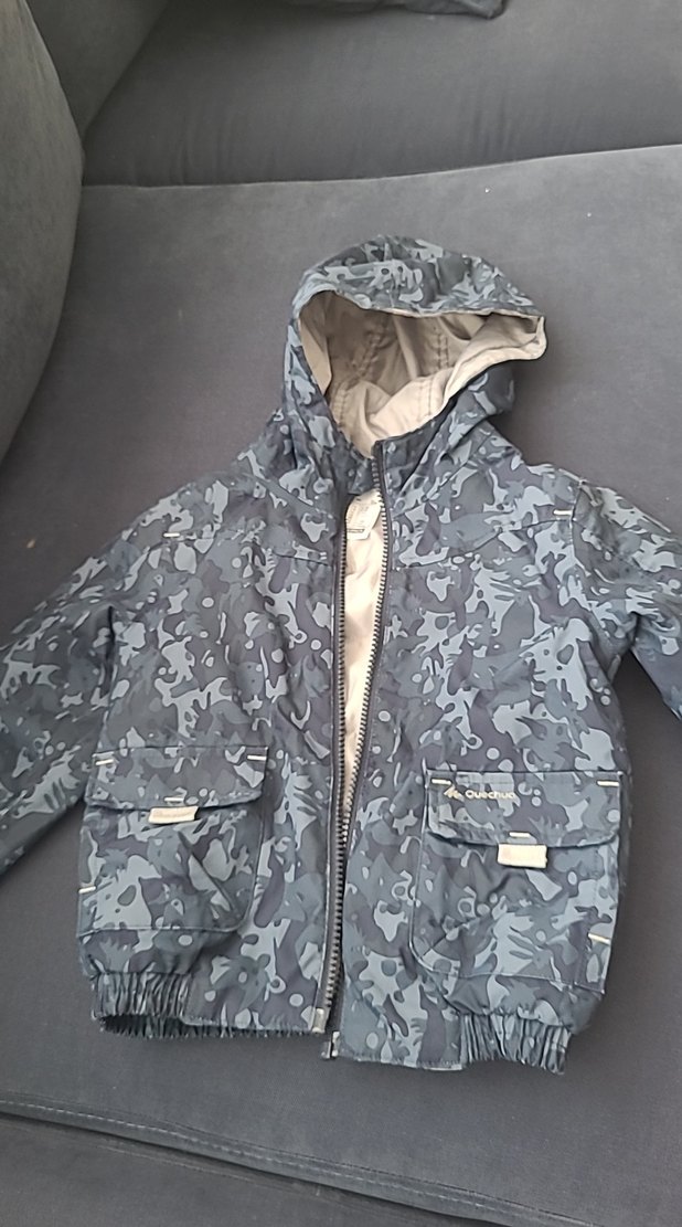 Gri kamuflaj desenli, kapüşonlu erkek çocuk montu. Fermuarlı ve notched lapel yakalı, bol kesim ve yumuşak sıcak kumaştan üretilmiştir.