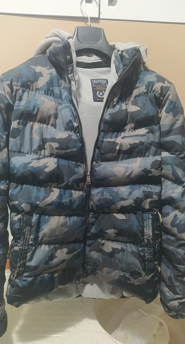 Gri kamuflaj desenli, düğmeli, normal midi boyda, uzun kollu, sentetik kumaştan erkek mont. Sokak stiline uygun, vücuda oturan kesim.