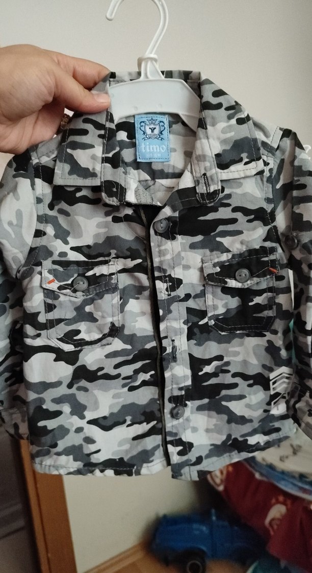 Gri kamuflaj desenli, uzun kollu, düğmeli ve kesimli erkek çocuk gömleği. Notlu yaka ve sentetik kumaş kullanılmış. sanırım cıvılden aldım, hiç giyilmedi.