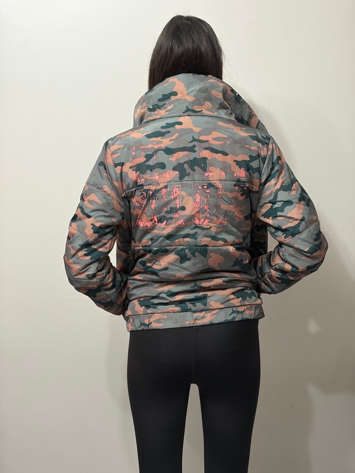 Gri kamuflaj desenli, uzun kollu, boğazlı ve fermuarlı kısa kesim kadın montu. Sentetik kumaştan, dış mekanlar için uygun.
