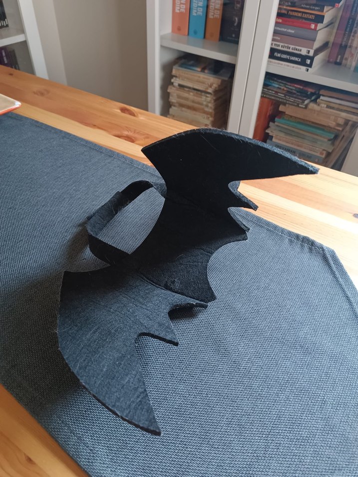 Detaylı kenarlara sahip büyük yarasa kanatları bulunan gri aksiyon figürü, koleksiyon veya sergileme için uygundur. Kedi kostümü