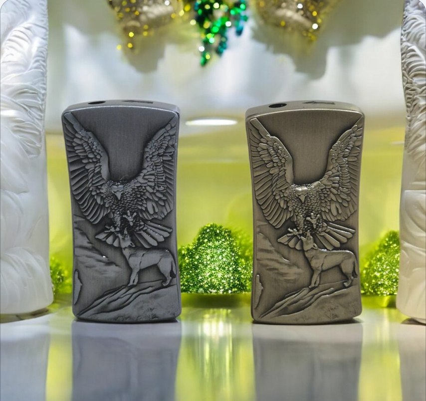 Gri renkli, kanatlarını açmış kartal ve at figürlü detaylı metal işçiliğine sahip power bank. ⚡