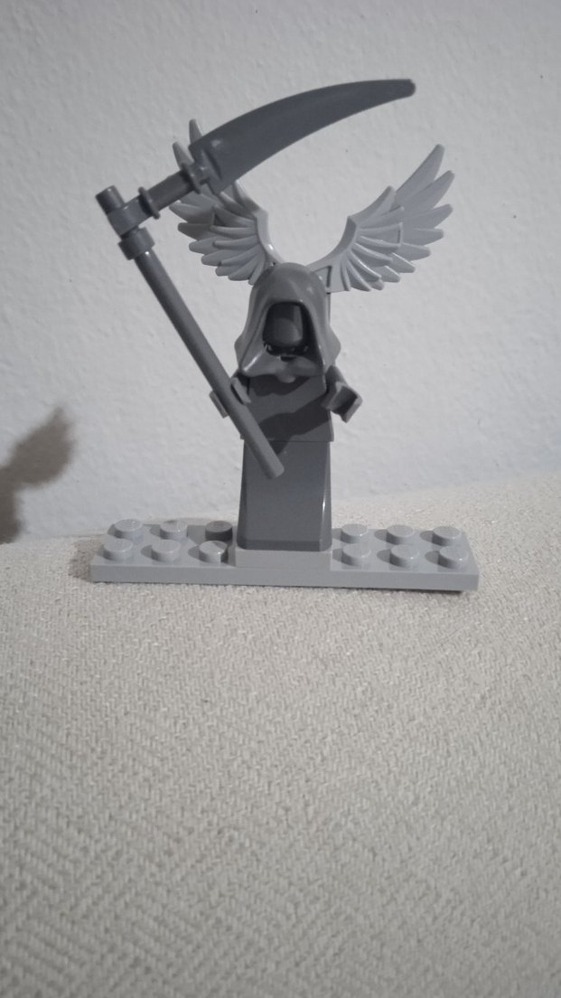 Gri kanatlı ve büyük bir orak taşıyan Lego figürü, gri taban plakası üzerinde duruyor. Figür kapüşonlu ve yüzü koyu renk detaylı.