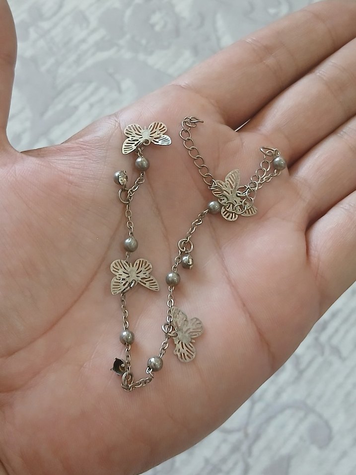 Gri kanatlı zincir detaylı, bohem tarzda kadın el zinciri, günlük kullanıma uygundur.