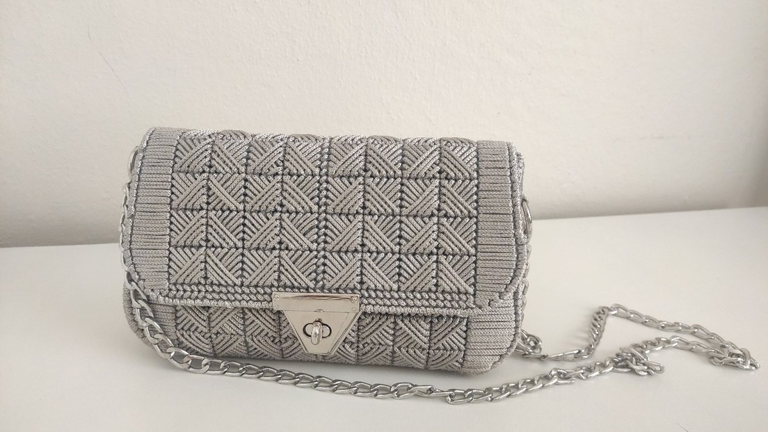 Gri renkte, işlemeli desenlerle örülmüş kadın çantasıdır. Metal zincir askısı ve bohem tarzıyla günlük kullanıma uygundur.
