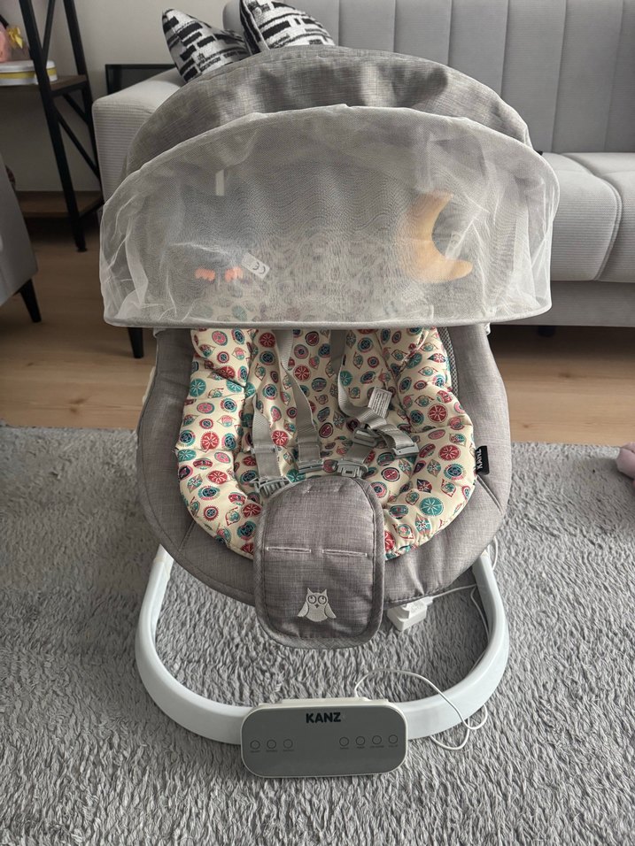 Yumuşak kumaşlı gri Kanz bebek beşiği ve salıncağı, koruyucu tül tente ve güvenli emniyet kemeri ile donatılmıştır. Ayarlanabilir kontrol paneli mevcuttur. Hiç kullanılmadı tertemiz. Kutusuyla gönderilecektir.