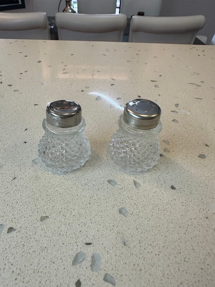 Gri metal kapaklı, dokulu camdan yapılmış tuzluk ve biberlik seti. Mutfaklarda kullanıma uygun klasik tasarım. Vintage Alman malıdır