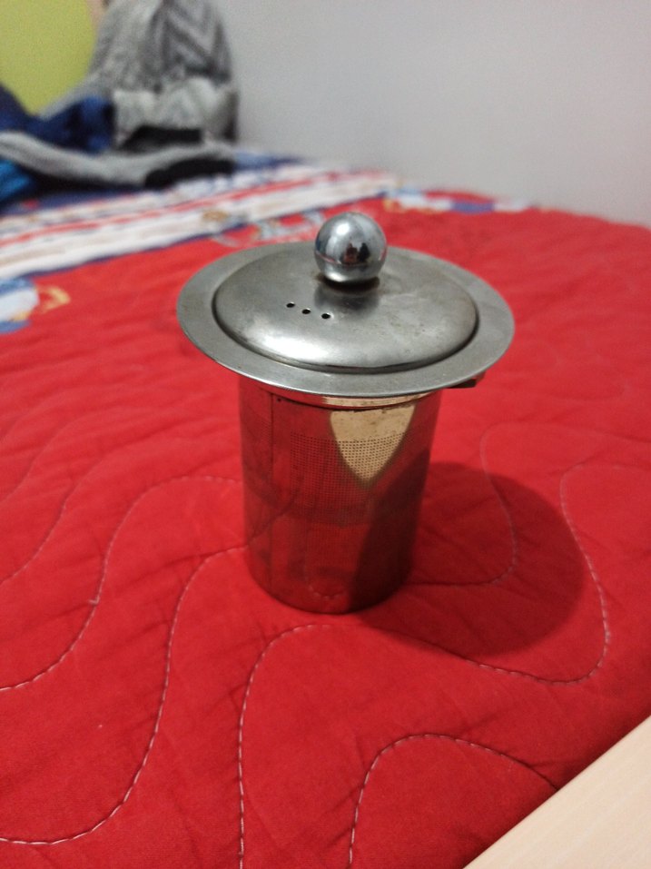 Gri kapaklı, havalandırma delikleri bulunan metal çaydanlık. Parlak yüzeyli ve kompakt yapıda, çay demlemek için uygundur.