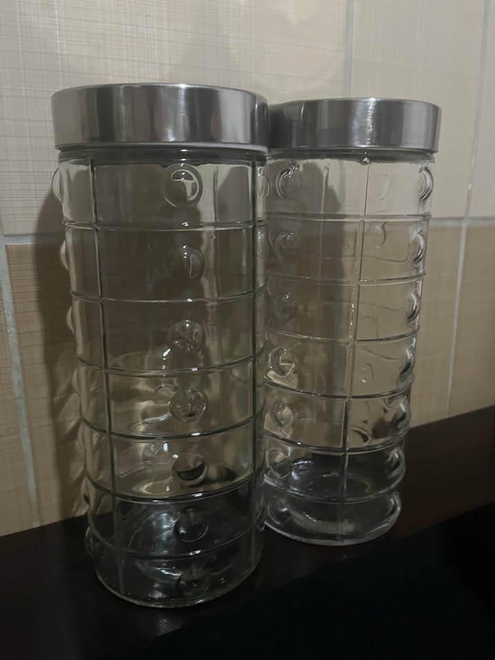 Gri kapaklı, desenli şeffaf cam saklama kavanozları. Mutfakta yiyecekleri güvenle saklamak için uygundur. ️
