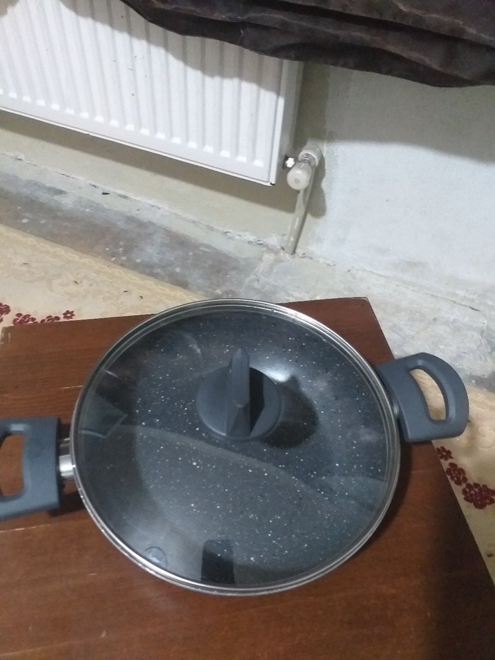 Her iki yanında kulpları ve cam kapağı bulunan gri tencere, çeşitli yemekler için uygundur.
