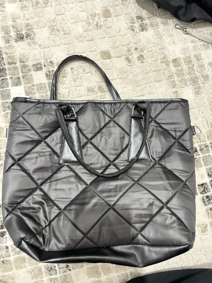 Gri kapitone desene sahip sentetik kumaştan yapılmış, siyah saplı ve fermuarlı kadın omuz çantası.