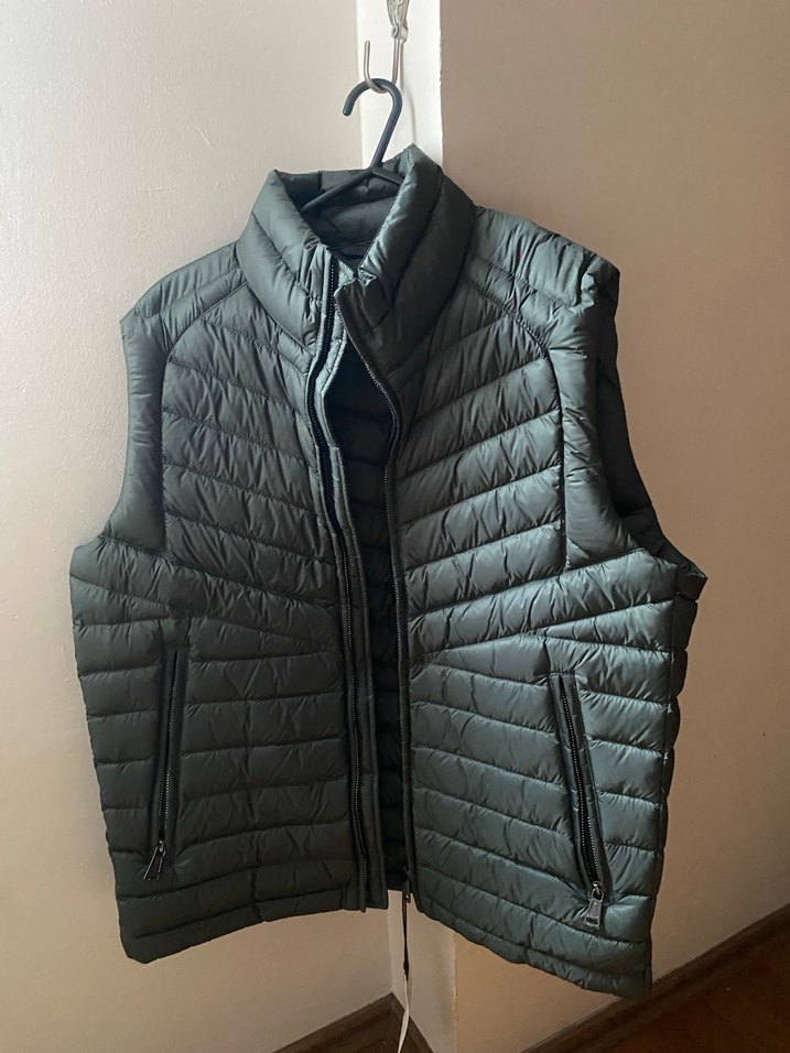 Gri renkte, yüksek yakalı ve fermuarlı ceplere sahip, sentetik kumaştan yapılmış, normal boy ve fitted kesim yelek. Günlük rahat stil için uygundur.