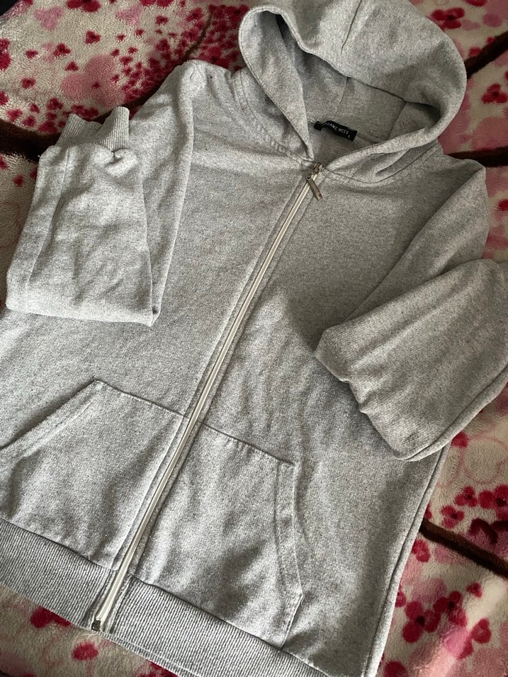 Gri kapüşonlu sweatshirt, fermuarlı ve uzun kolludur. Yumuşak ve sıcak kumaştan yapılmış, bol kesim ve normal uzunluktadır. Rahat sokak stili için uygundur. Kadın ve erkek için uygundur.