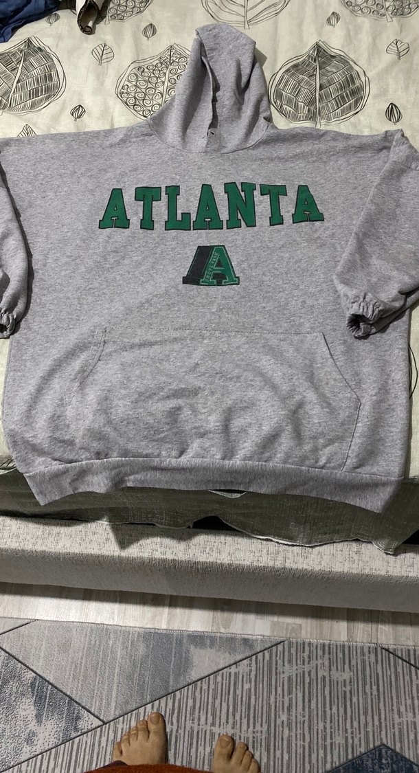 Gri kapüşonlu sweatshirt, bol kesim, uzun kollu ve önünde fermuarlı. 'ATLANTA' baskısı ile casual ve spor tarzına uygun.