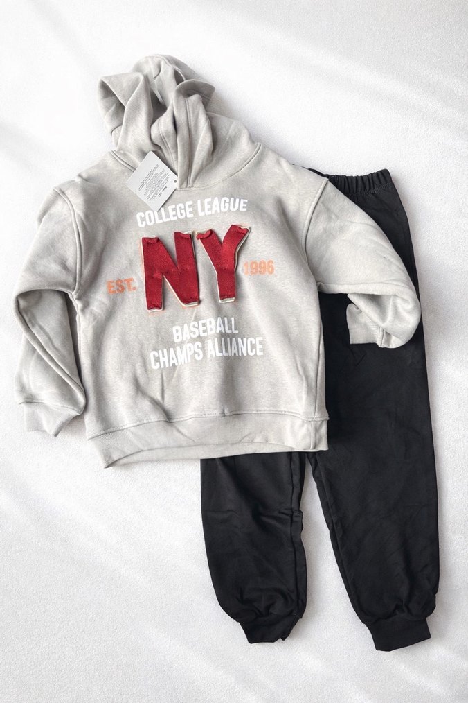 Gri kapüşonlu sweatshirt ve siyah pantolondan oluşan, baskılı NY temalı, bol kesim erkek eşofman takımı. Rahat ve şık görünümlü. ⚾